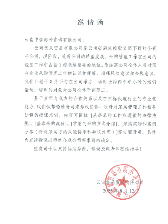 云南中咨海外咨询有限公司凭借二十余年招标采购领域专业积淀与丰富实践经验,获长期合作伙伴 —— 云南集采贸易有限公司(云南省康旅控股集团全资子公司)信赖,受邀为其开展采购管理专题培训,助力其转型发展中采购管理体系规范化建设 。