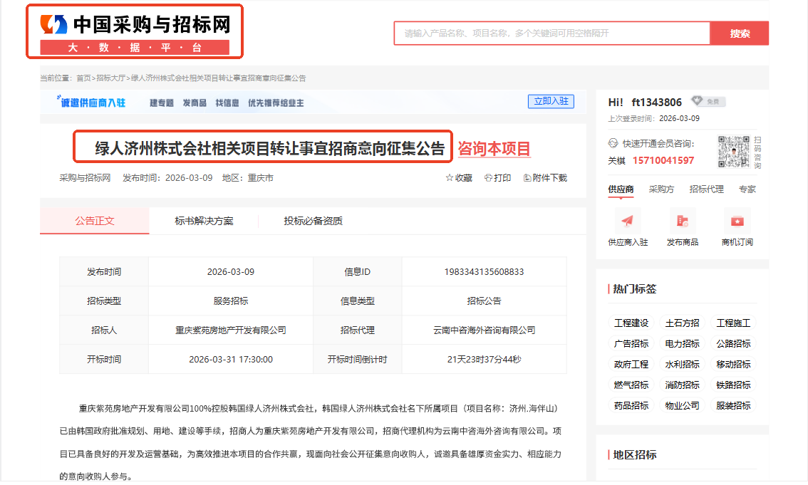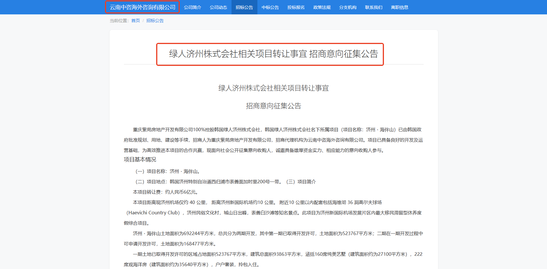 云南中咨海外代理招商的韩国“济州·海伴山”项目具备良好的开发及运营基础,现面向社会公开征集意向收购人,诚邀您的参与,共谋发展。